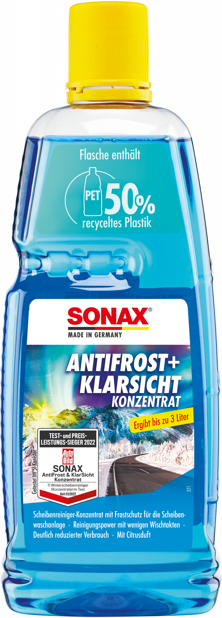 Scheibenreiniger-Konzentrat mit Frostschutz für die Scheibenwaschanlage. Beseitigt Öl, Ruß, Salz und sonstige typische Winterverschmutzungen mit wenigen Wischtakten und damit reduziertem Verbrauch. Verhindert Düsenvereisung und das Einfrieren der Scheibenwaschanlage. Absolut lack-, gummi- und kunststoffverträglich. Verursacht keine Spannungsrisse und Blindstellen an Scheinwerferstreuscheiben. Bestens geeignet für hochwertige Laser-, Matrix-LED- sowie XENON-Scheinwerfer. Getestet auf Mattlacken, folierten Fahrzeugen und empfindlichen Reparaturlacken. Mit Glycerin. Hält Gummi geschmeidig. Kein Rubbeln der Wischerblätter. Fächerdüsentauglich - auch ideal für den Einsatz bei neuen Wischertechnologien. Dank Antikalk-Effekt auch für die Mischung mit hartem Wasser geeignet.
