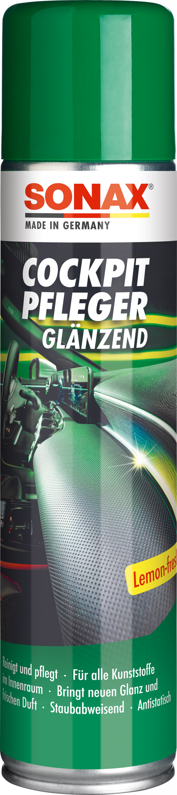 Der Klassiker: reinigt und pflegt alle Kunststoffteile im Auto. Bringt neuen Glanz und angenehmen Vanilleduft ins Cockpit. Er wirkt staubabweisend, antistatisch und schützt Kunststoff vor dem Brüchigwerden. SONAX CockpitPfleger eignet sich auch für Holzarmaturen. Silikonfrei.