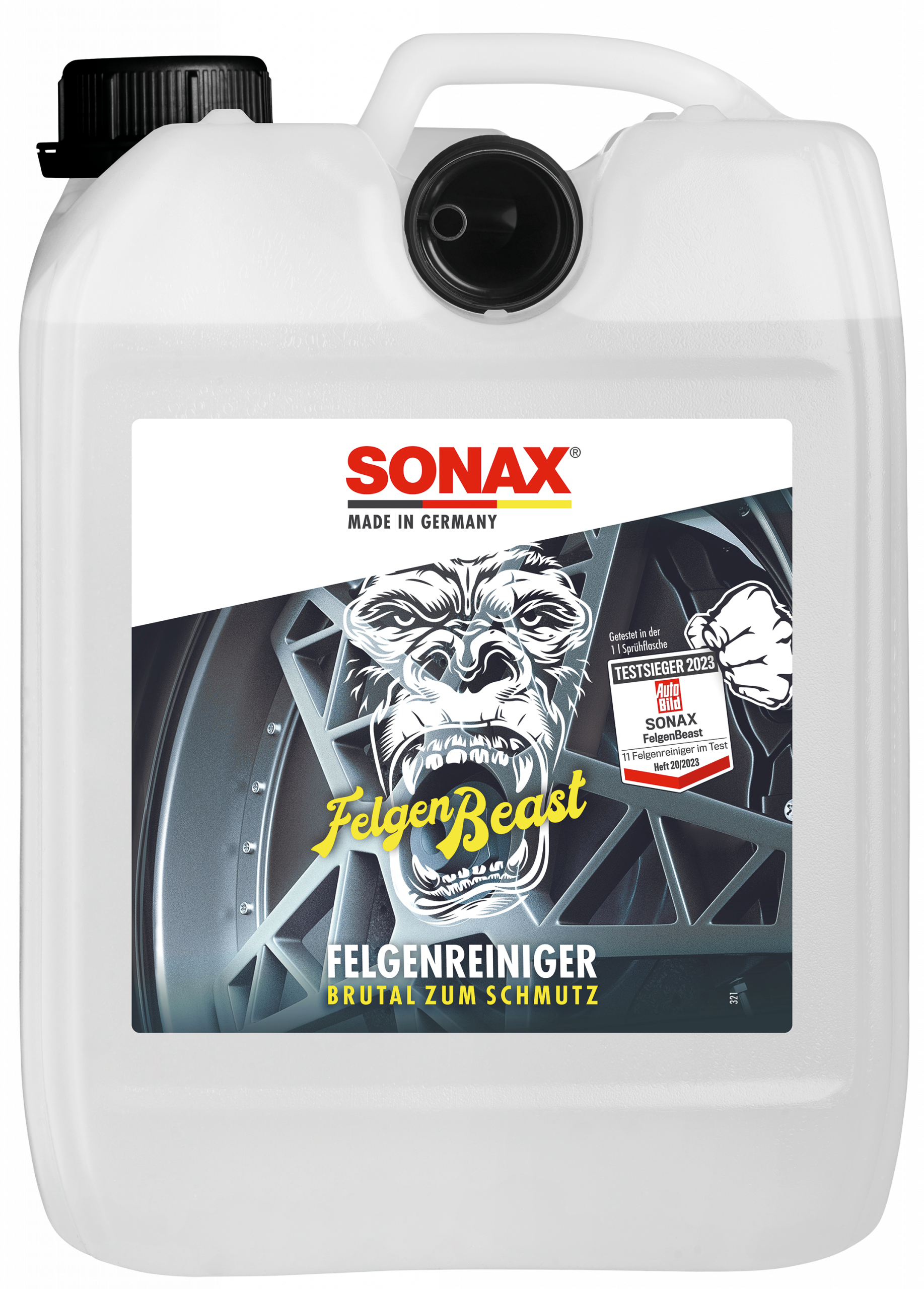 Lässt Schmutz keine Chance! Für alle Stahl- und Leichtmetallfelgen + lackierte, verchromte, polierte und matte Felgen. Entfernt selbst biestige Verschmutzungen. Das SONAX FelgenBeast verfärbt sich rötlich und entfaltet seine ganze Reinigungskraft. Besonders materialschonend, greift weder die Felgenoberfläche noch Radbolzen an. Für Räder mit RDKS (Reifendruck-Kontrollsystem) geeignet. Mit frischem Duft.