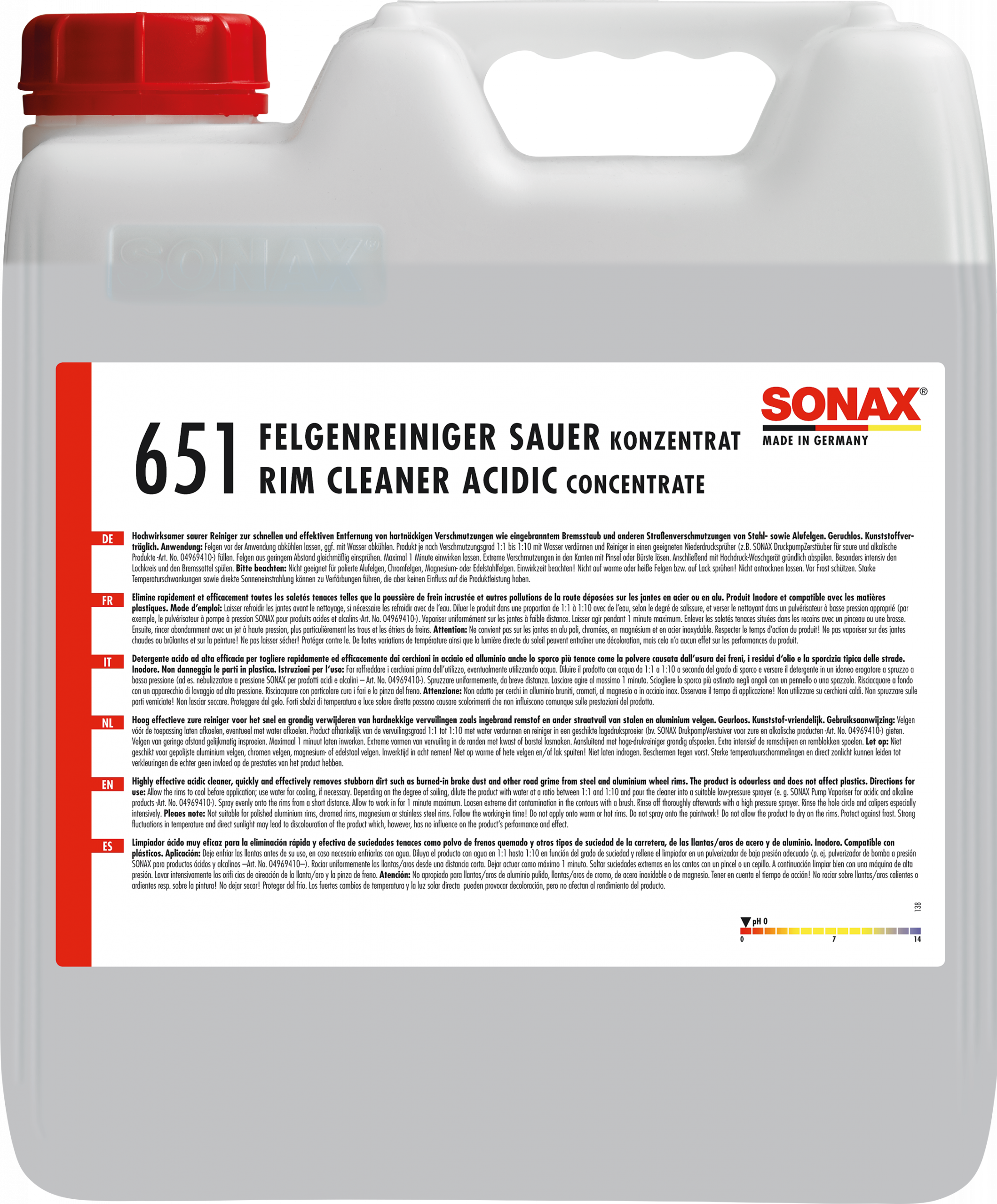 Hochwirksamer saurer Reiniger zur schnellen und effektiven Entfernung von hartnäckigen Verschmutzungen wie eingebranntem Bremsstaub und anderen Straßenverschmutzungen von Stahl- sowie Alufelgen. Beseitigt Vergilbungen auf den Felgen und Radkappen infolge Winterbetriebs. Geruchlos. Kunststoffverträglich. Konzentrat, verdünnbar bis 1:10.