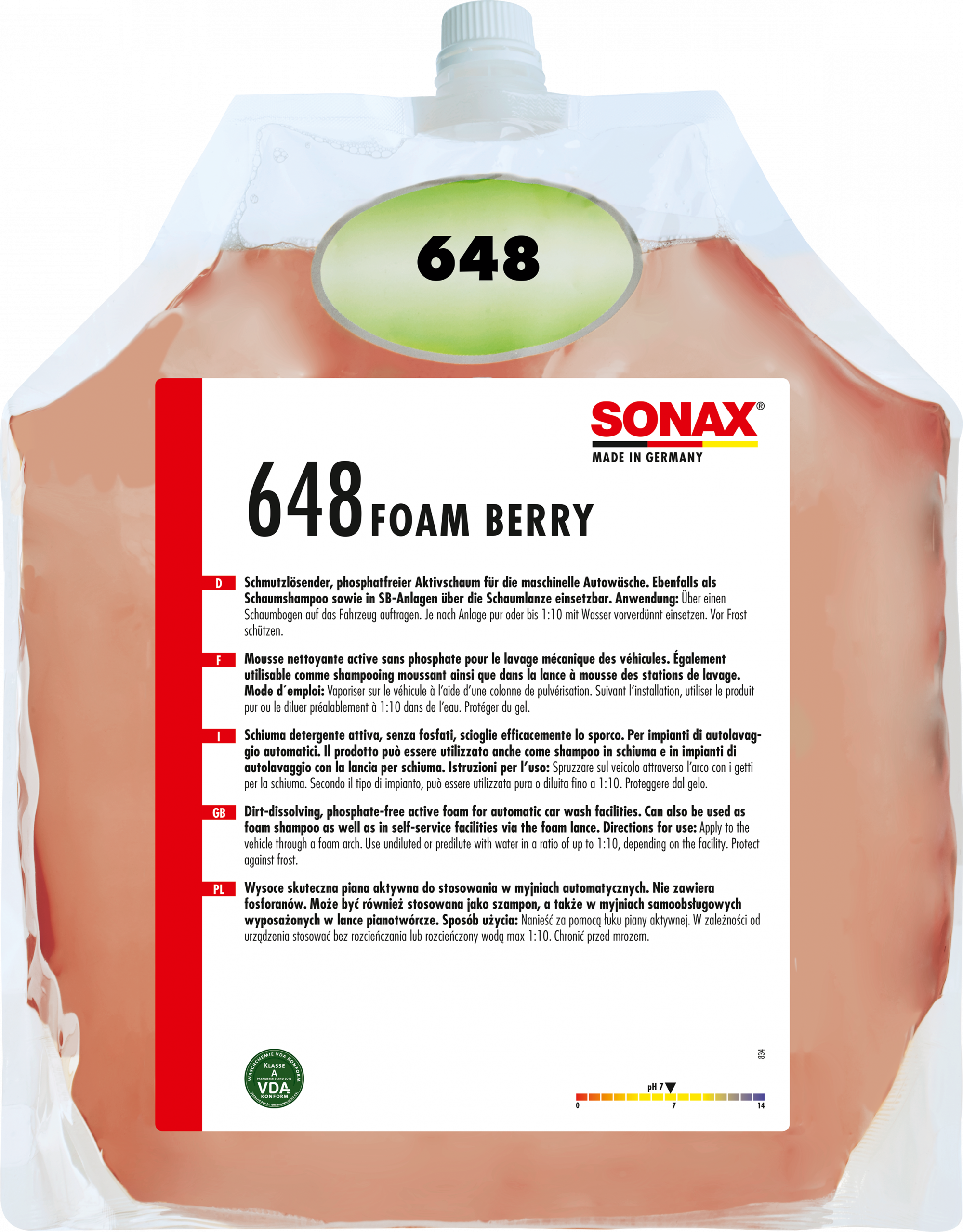 Phosphatfreier Reiniger mit Aktivschaumkraft zur Entfernung von Insekten und anderen angetrockneten Verschmutzungen in der maschinellen Fahrzeugwäsche. Mit fruchtigem Beerenduft.