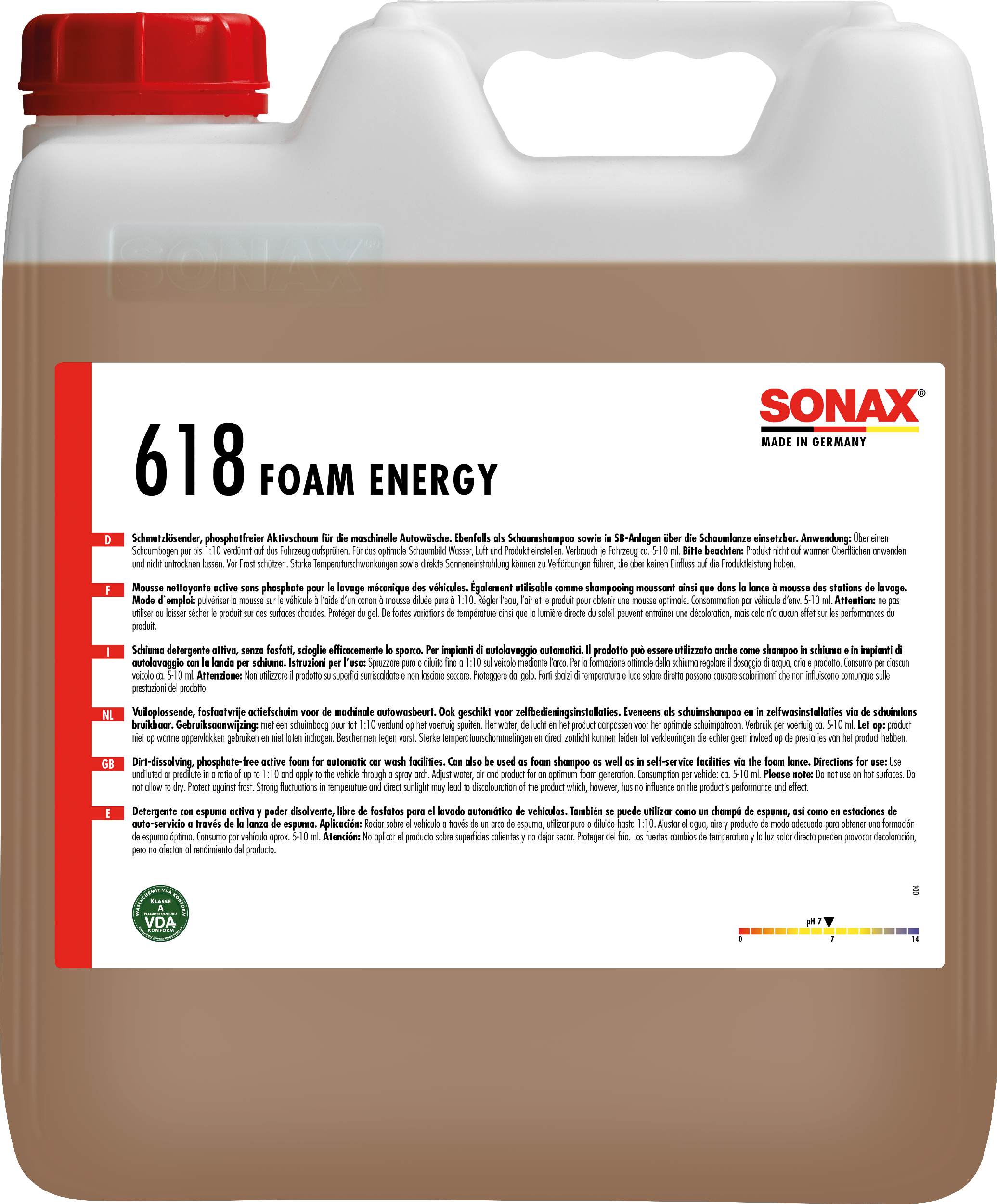 Phosphatfreier Reiniger mit Aktivschaumkraft zur Entfernung von Insekten und anderen angetrockneten Verschmutzungen in der maschinellen Fahrzeugwäsche. Auch einsetzbar als Shampoo und Insektenentferner. Mit frischem Energyduft.