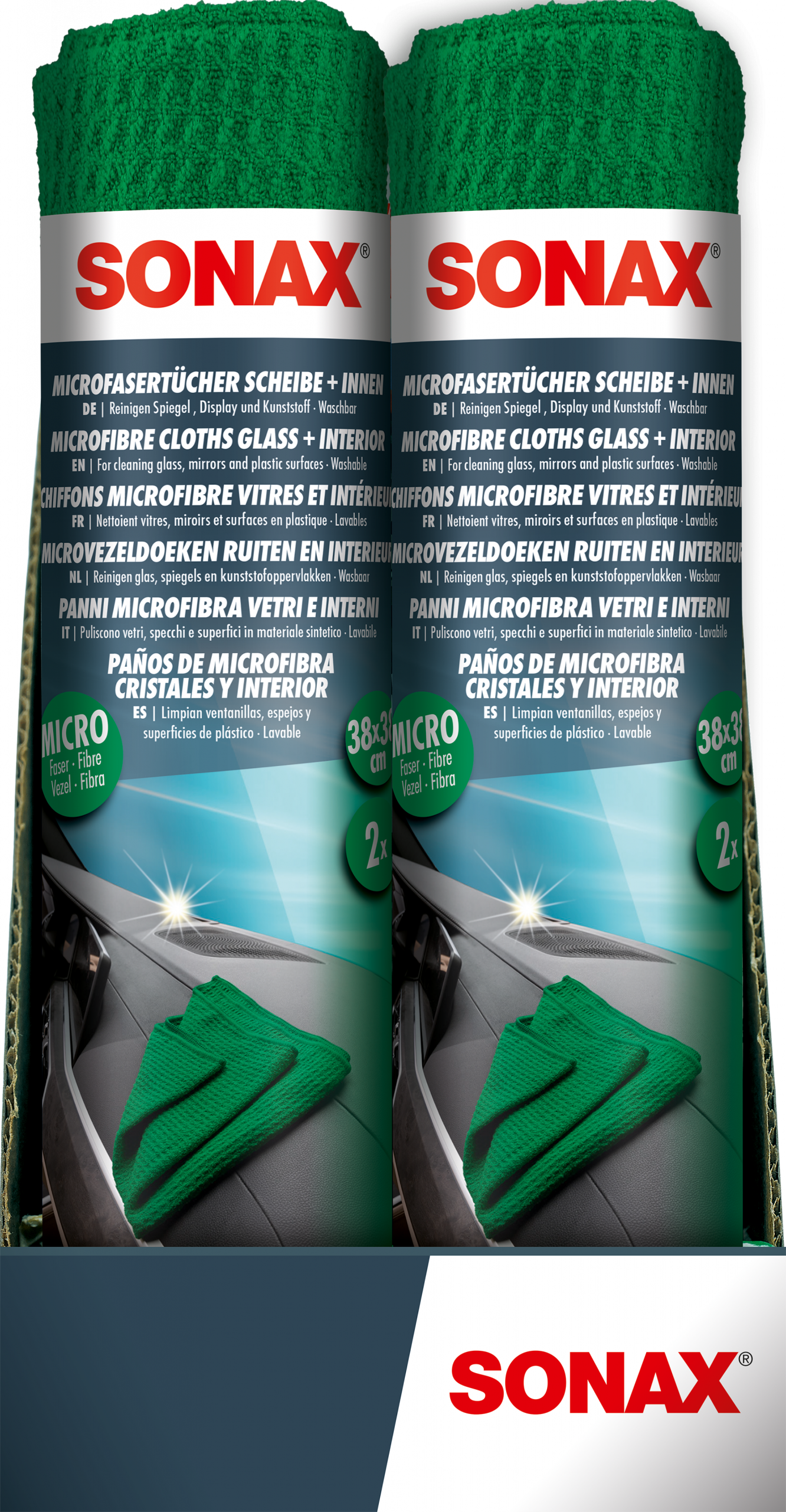 Feucht bzw. mit unterstützenden Spezialreinigern (z.B. SONAX ScheibenKlar etc.) zur leichteren Reinigung, trocken zum Nachwischen und zum streifenfreien Polieren. Maschinenwaschbar bei 40 °C. Keinen Weichspüler verwenden. Wäschetrockner bei niedriger Temperatur benutzen. Separat waschen.