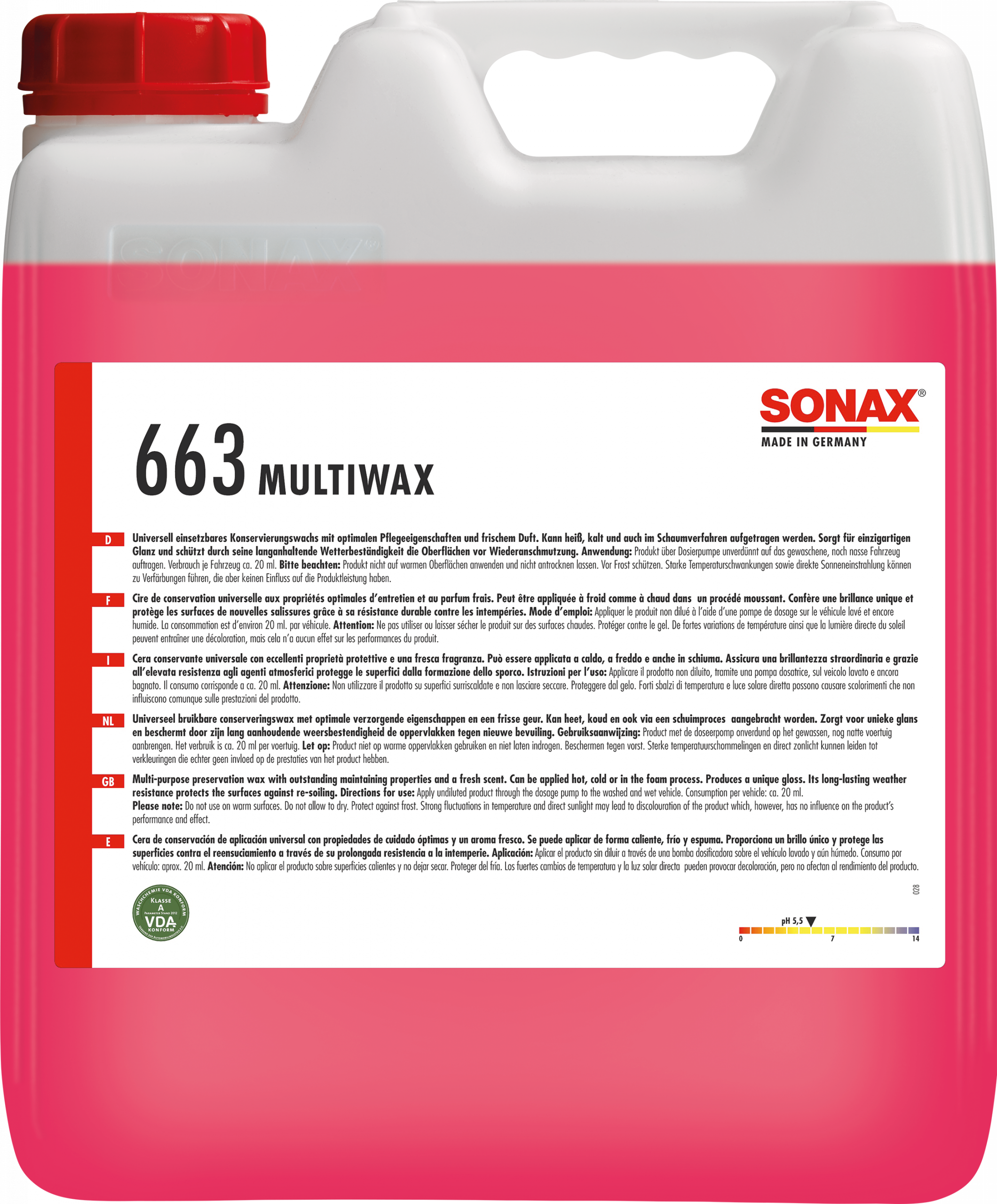 Innovatives, multifunktionelles Wachskonzentrat zur Pflege und zum Schutz der Lackoberfläche bei der maschinellen Fahrzeugwäsche. Die hochwertigen Mikrowachse pflegen und konservieren den Lack und schützen ihn dadurch vor widrigen Umwelteinflüssen. Das Wachs kann heiß, kalt und im Schaumverfahren aufgebracht werden und bewirkt eine einzigartige Farbvertiefung mit unglaublichem Glanzeffekt. Mit angenehm frischem Duft.