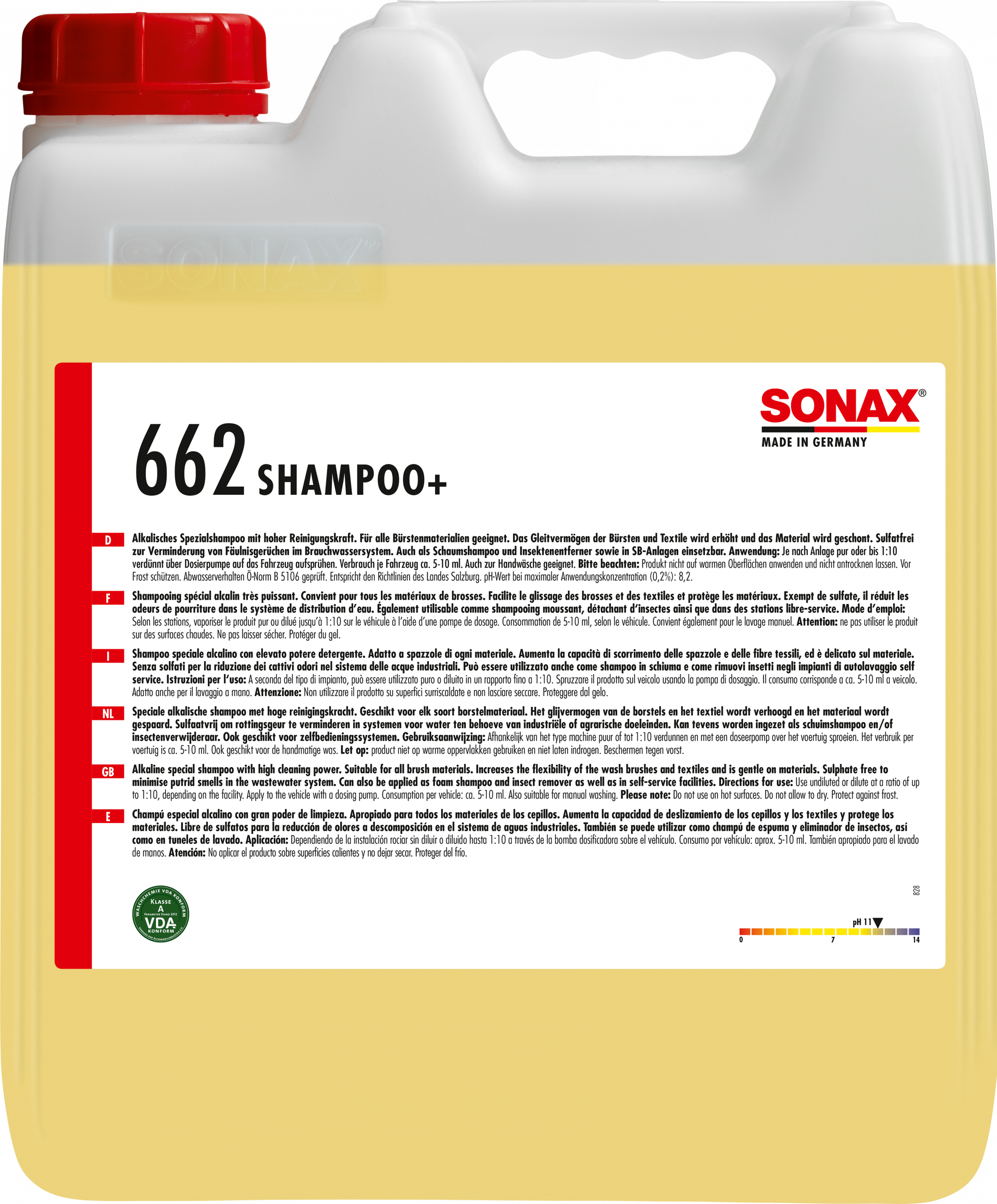 Mild alkalisch eingestelltes, sulfatfreies Bürstenshampoo. Sehr gut benetzungsfähig für einen hervorragenden Schmutzabtrag. Hochkonzentriert und sehr ergiebig. Verbessert die Brauchwasserqualität. Auch als Aktivschaum sowie als milder Vorreiniger einsetzbar. Verhindert die Bildung von Fäulnisgerüchen im Brauchwassersystem. Nichtionisch und phosphatfrei.