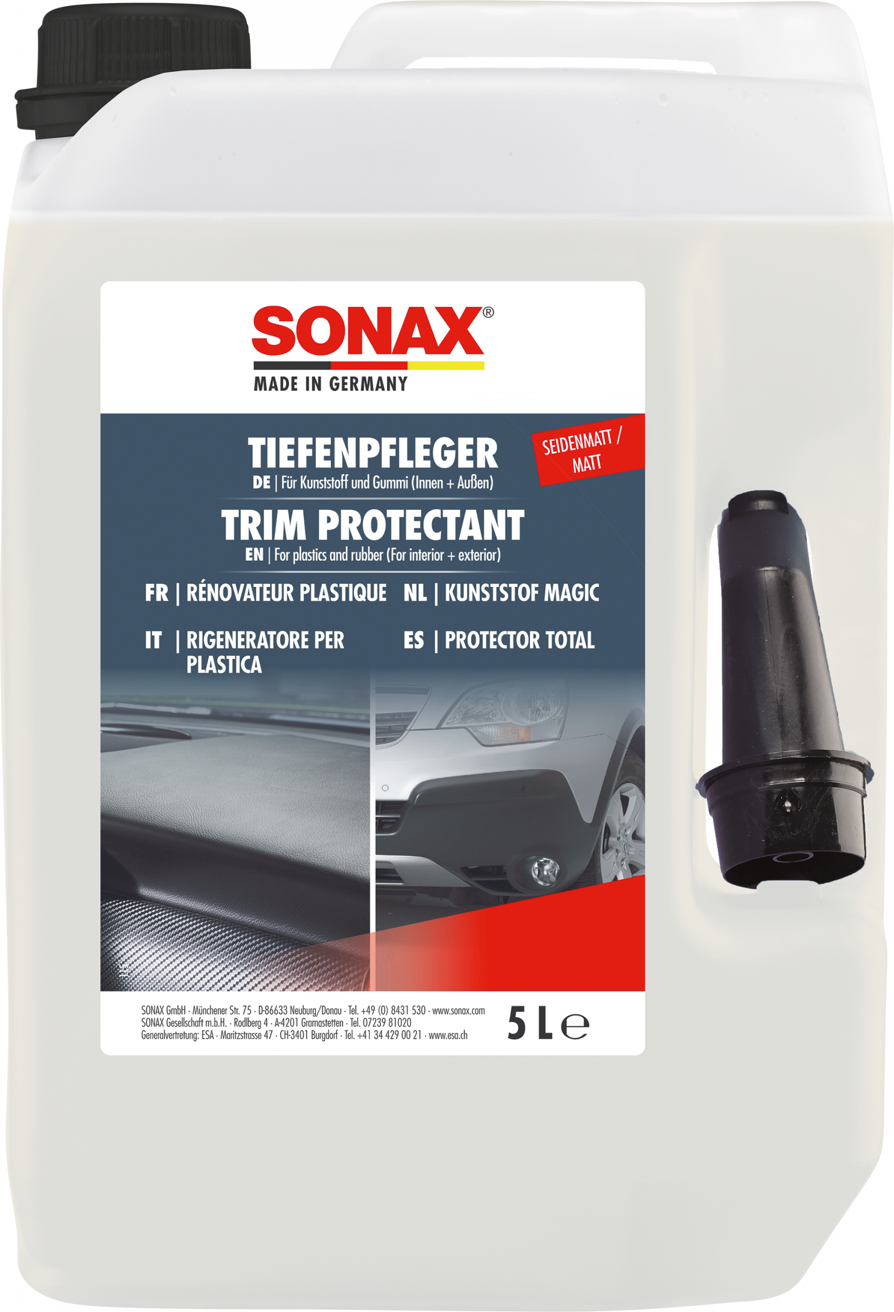 Der SONAX TiefenPfleger seidenmatt reinigt gründlich und hinterlässt auf den behandelten Oberflächen eine pflegende seidenmatte Schicht. Dadurch werden Kunststoff und Gummi noch länger vor Schmutz und Witterungseinflüssen geschützt - insbesondere auch vor dem Ausbleichen durch UV-Strahlen. Frischt die Farben wieder auf, die Oberfläche erhält ein mattes gepflegtes Aussehen, einen dauerhaften Abperleffekt und einen verbesserten Schutz vor Wiederverschmutzung. Das ursprünglich matte Aussehen des Cockpits bleibt erhalten, störende Reflektionen an der Frontscheibe werden vermieden. Hinterlässt einen neuen frischen Duft.